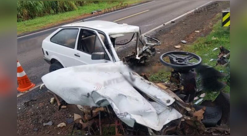Colisão frontal envolvendo dois carros deixa vítima fatal, ferido e rastro de destruição